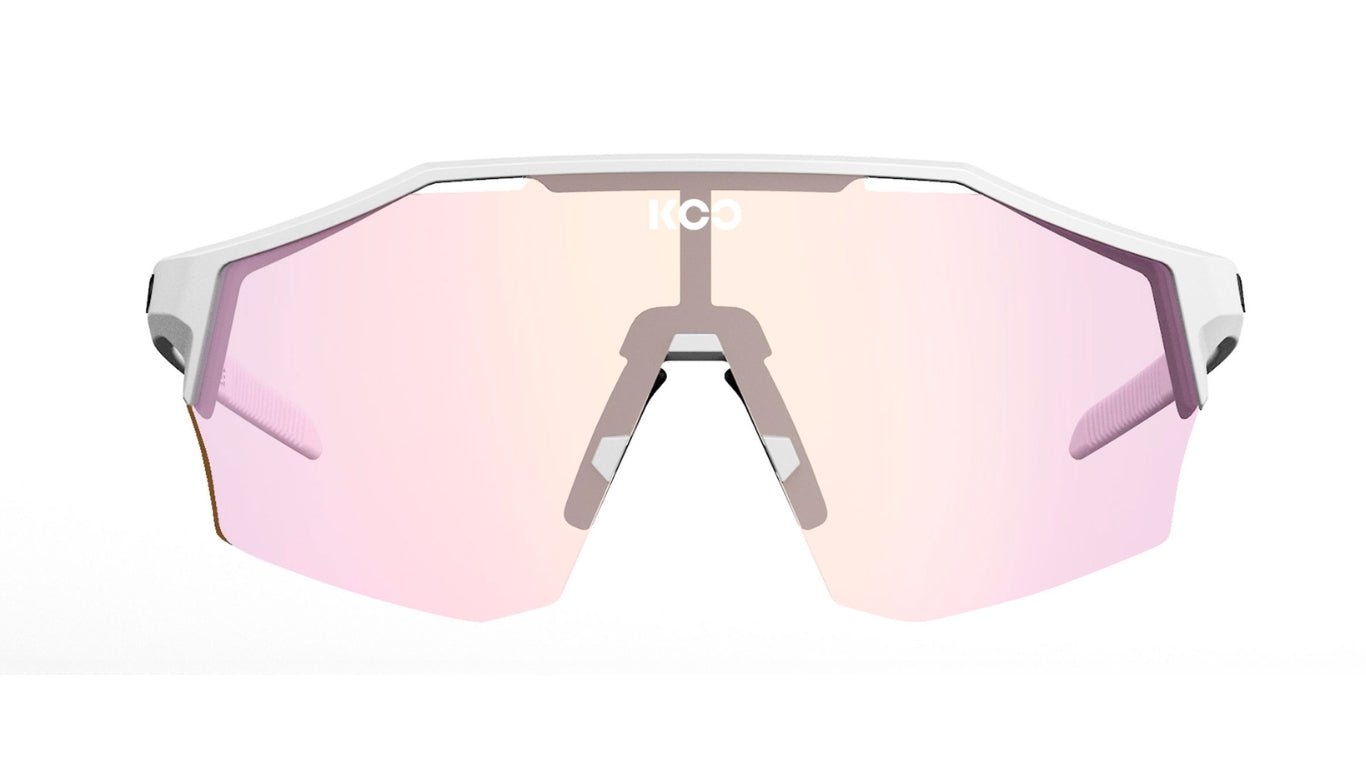 Maak kennis met de KOO Alibi Large in White Matt / Fuchsia Photochromic, een sportbril voor alle omstandigheden.