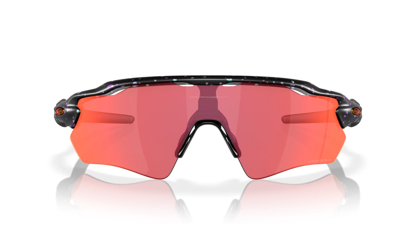 De Oakley Radar EV Path in de spectaculaire kleurstelling Matte Green Purple Colorshift Splatter is een uniek sportbril met een kleurenverloop dat afhankelijk van het licht.